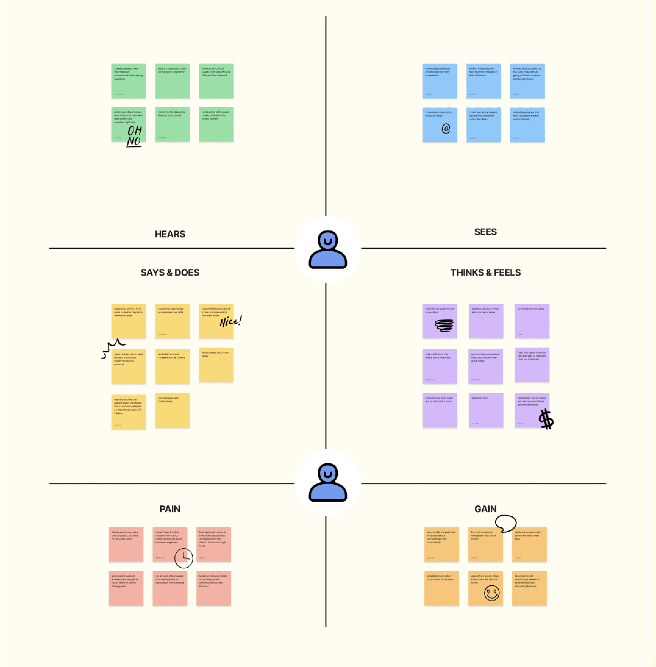 By visualizing our user’s thoughts, feelings, actions, and observations through an empathy map, we were able to pull out pain points and areas of opportunity.