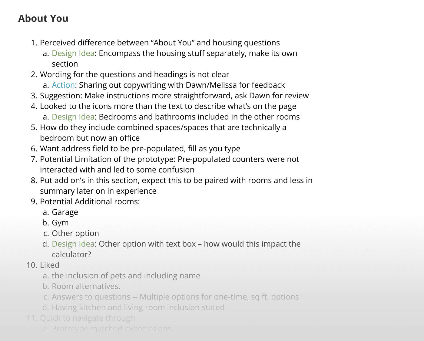 An example of our complete list of takeaways, noting actions and design ideas that fostered insights.
