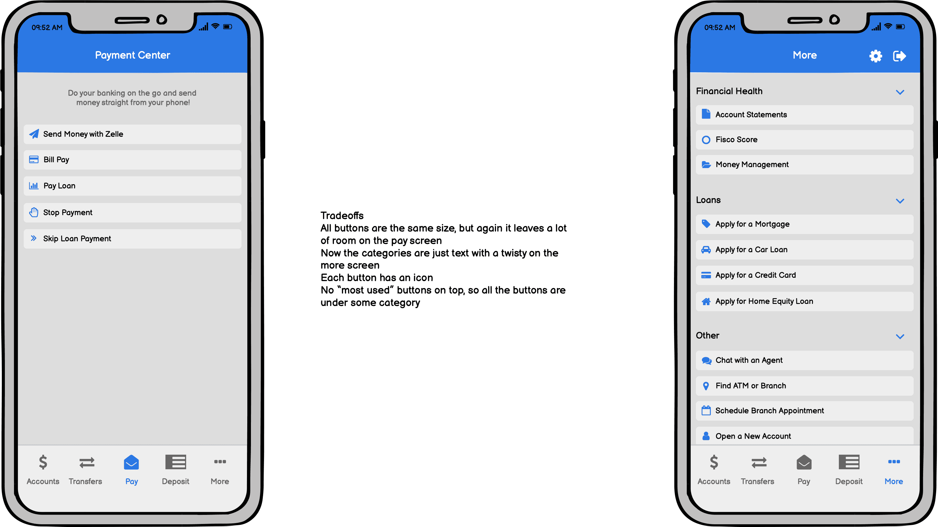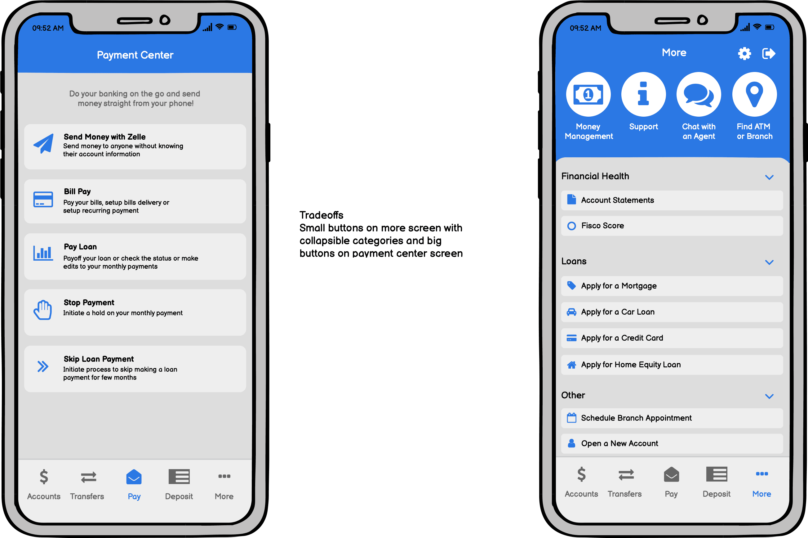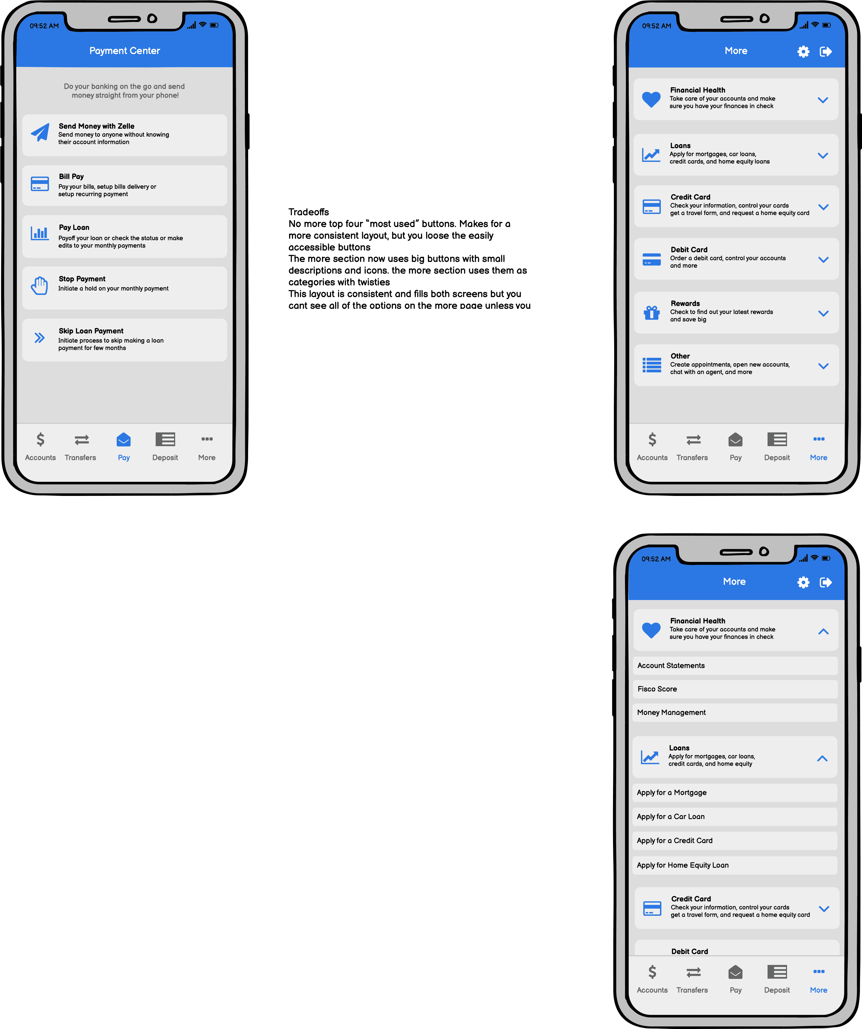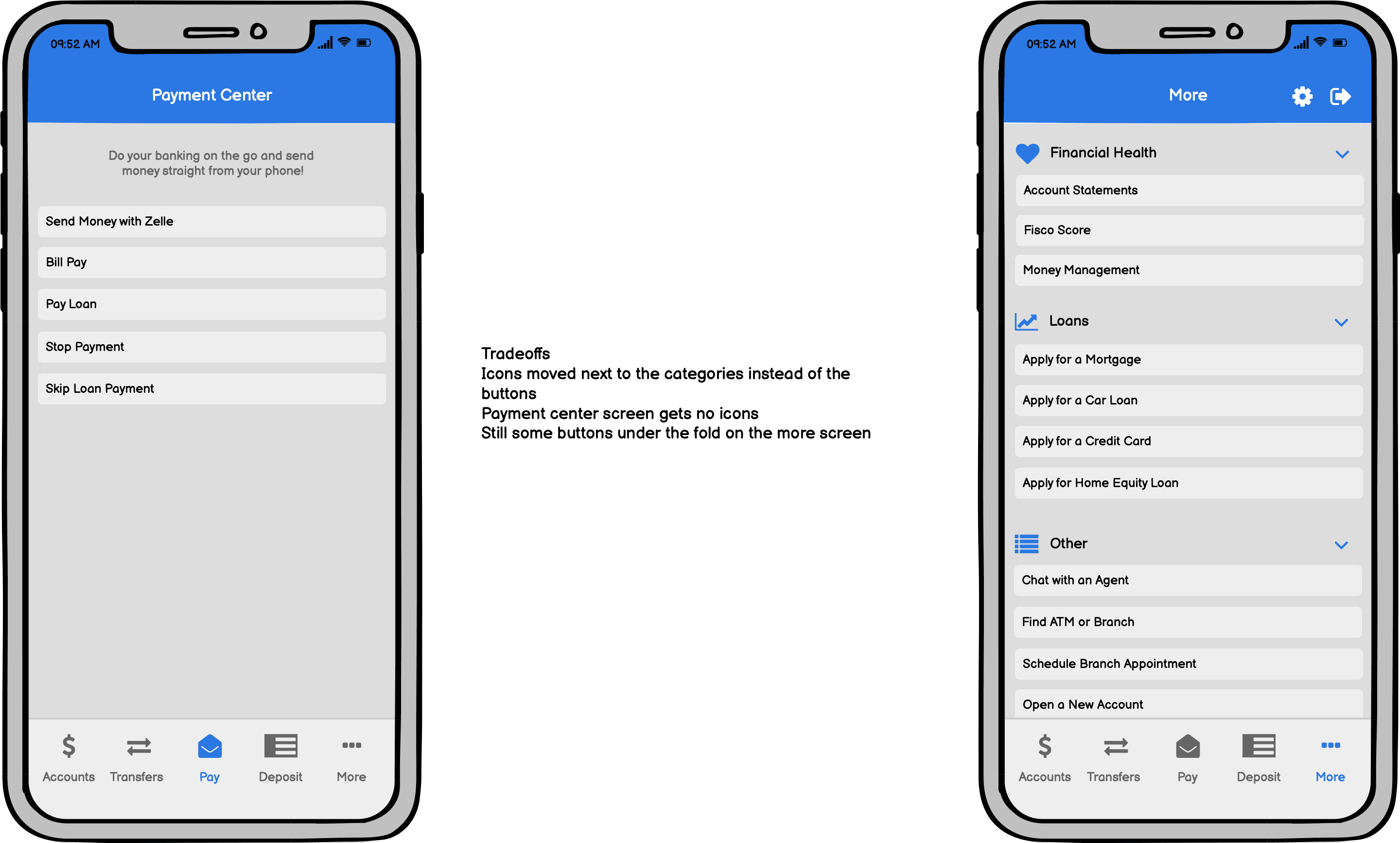 Unifying and organizing the layout of buttons in an existing banking app "Pay" and "More" screens