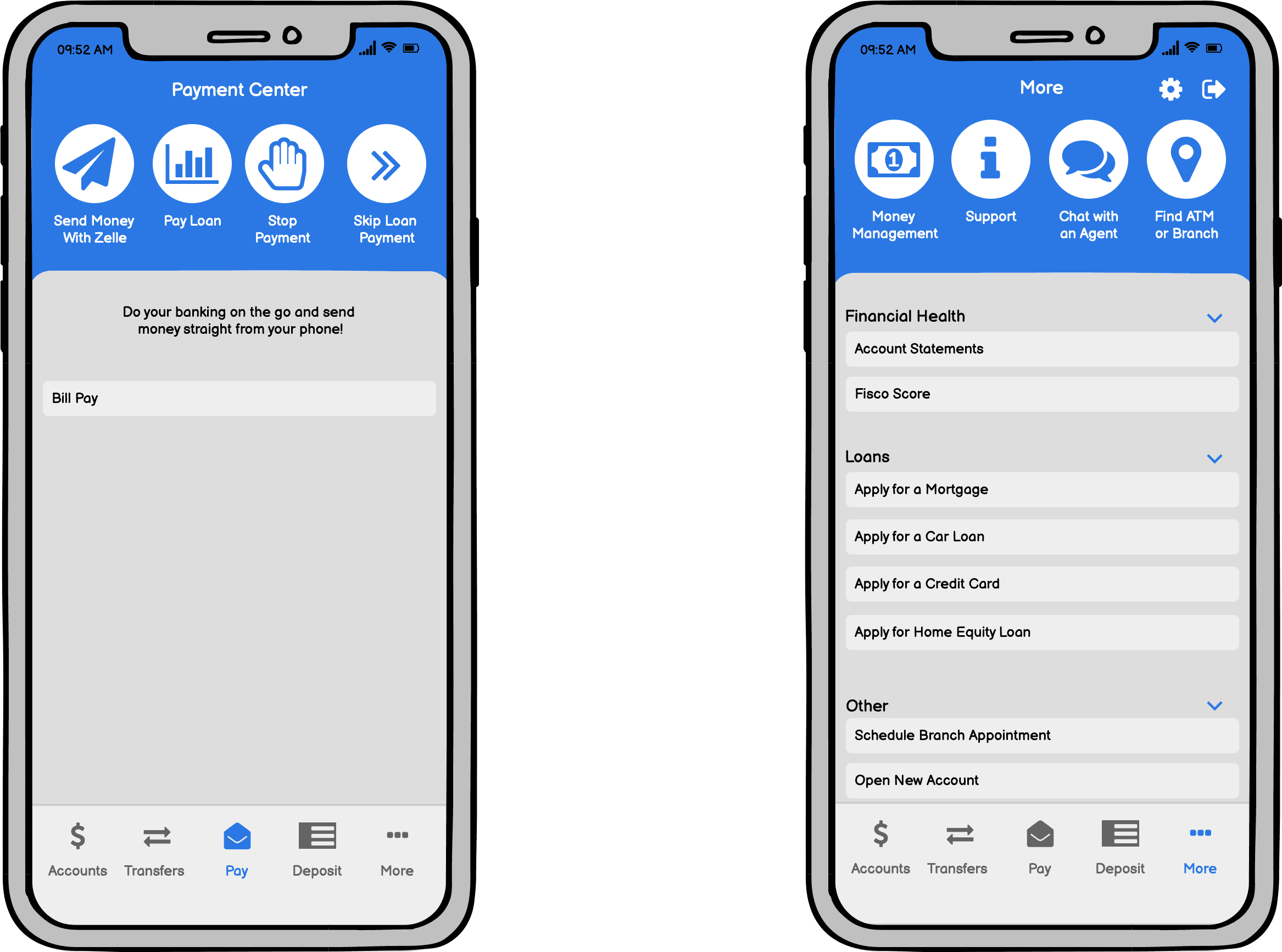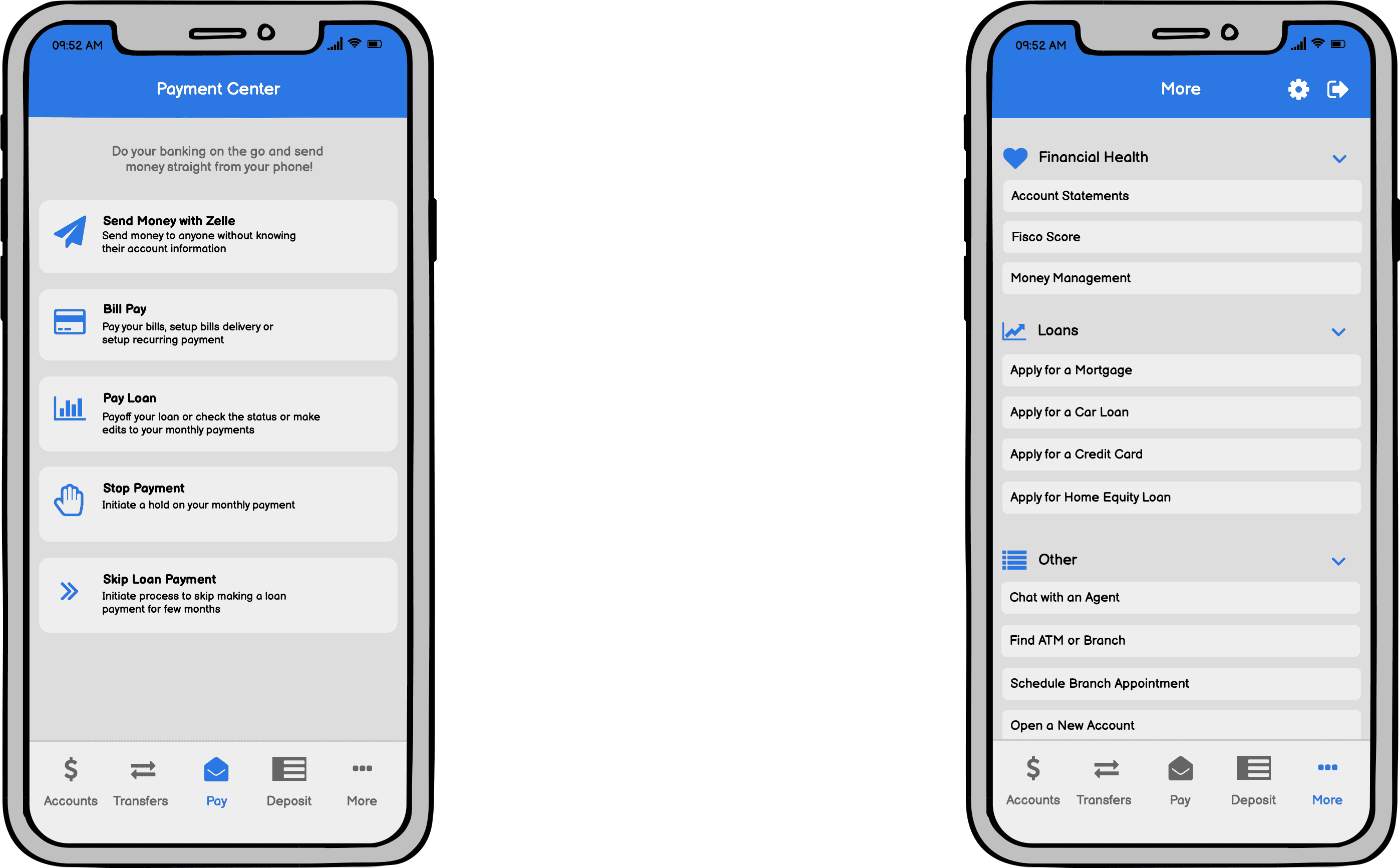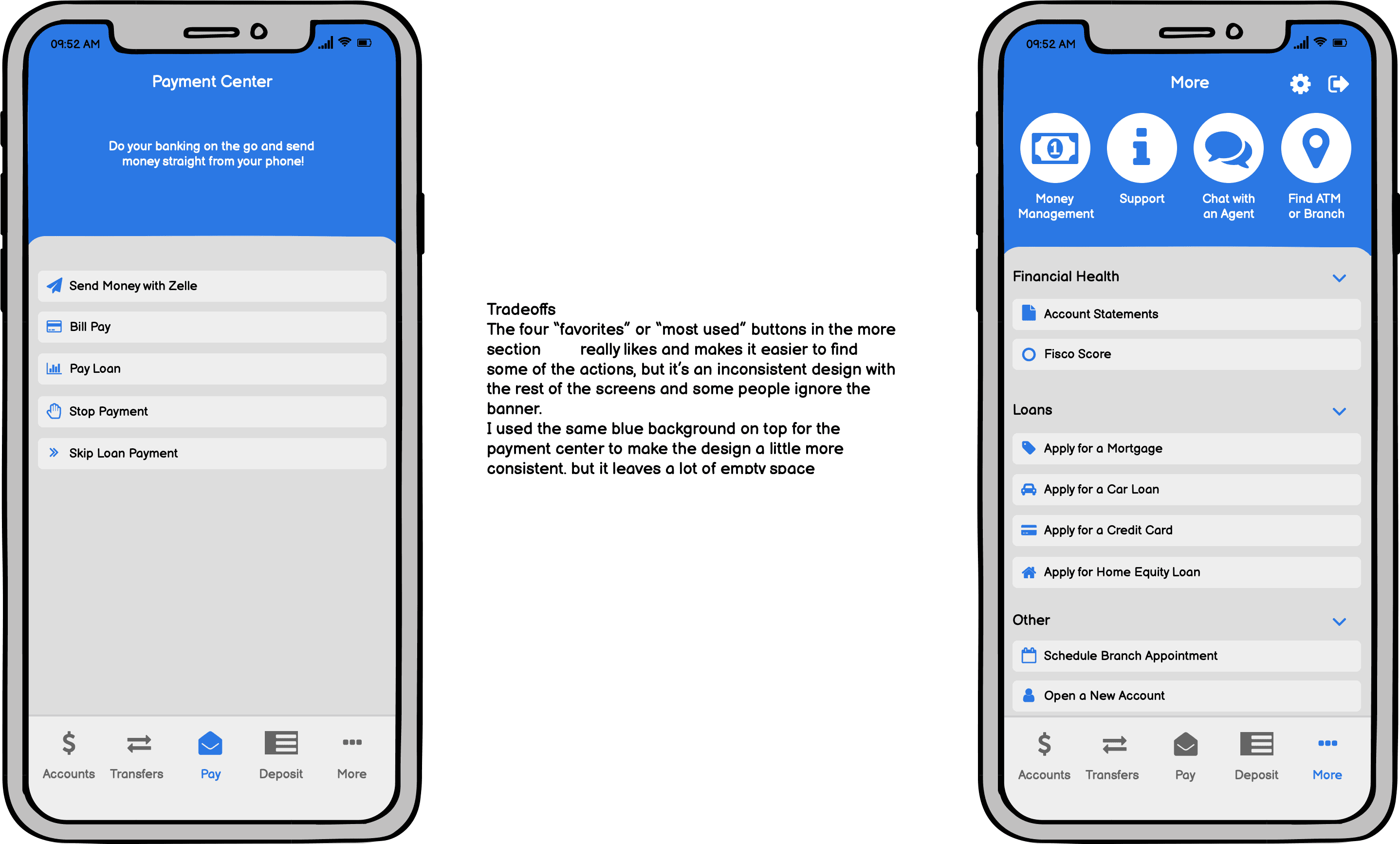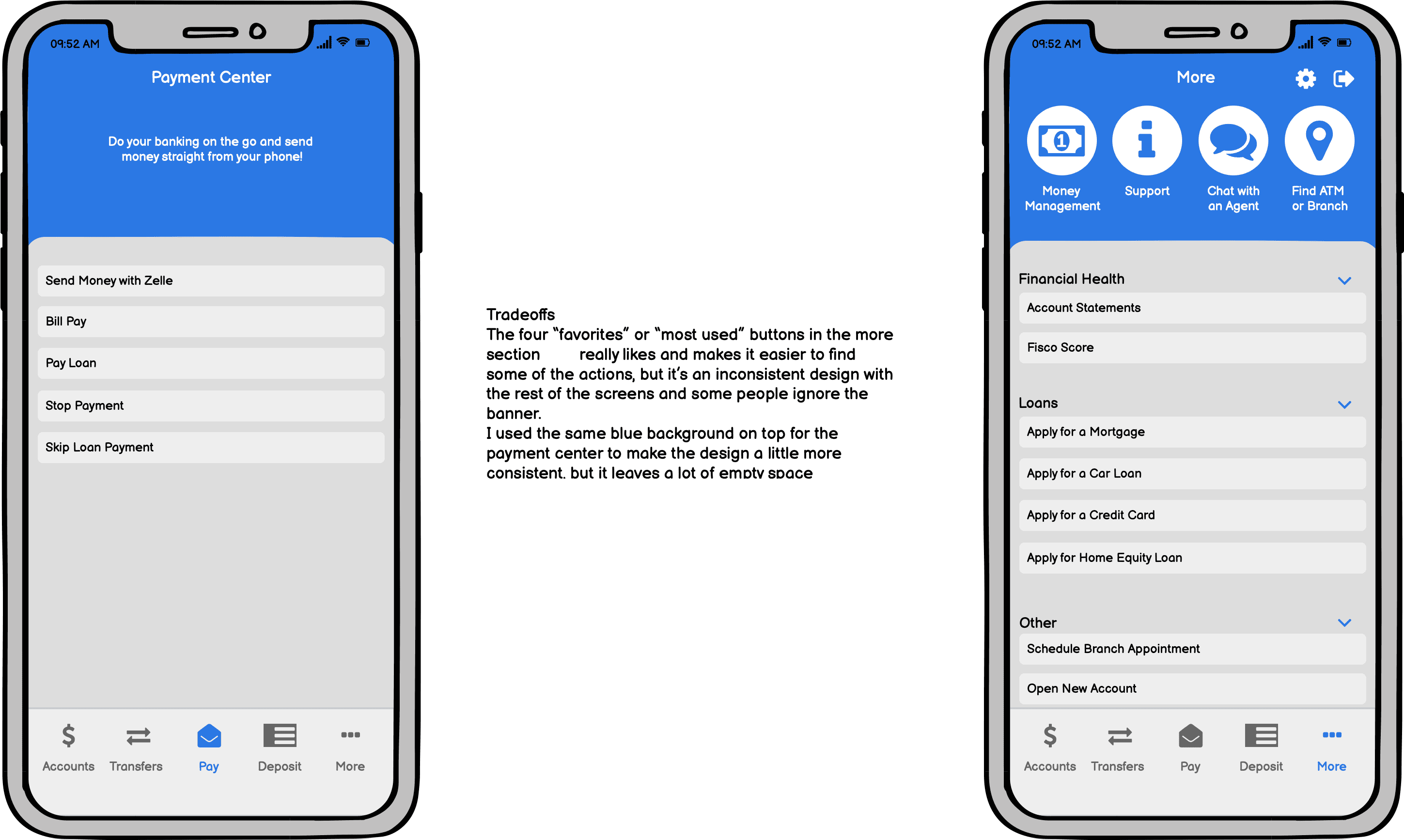 Unifying and organizing the layout of buttons in an existing banking app "Pay" and "More" screens