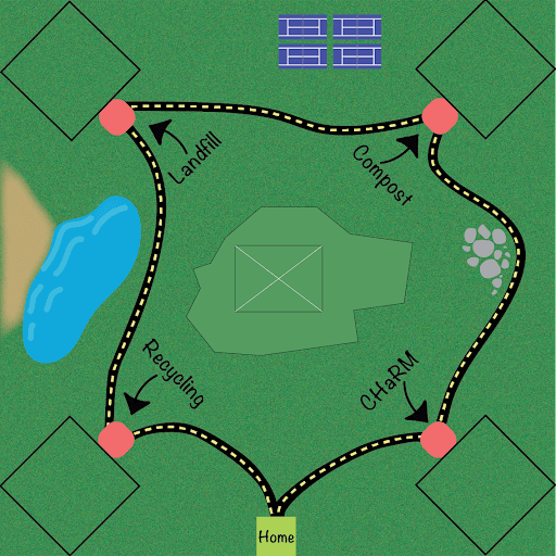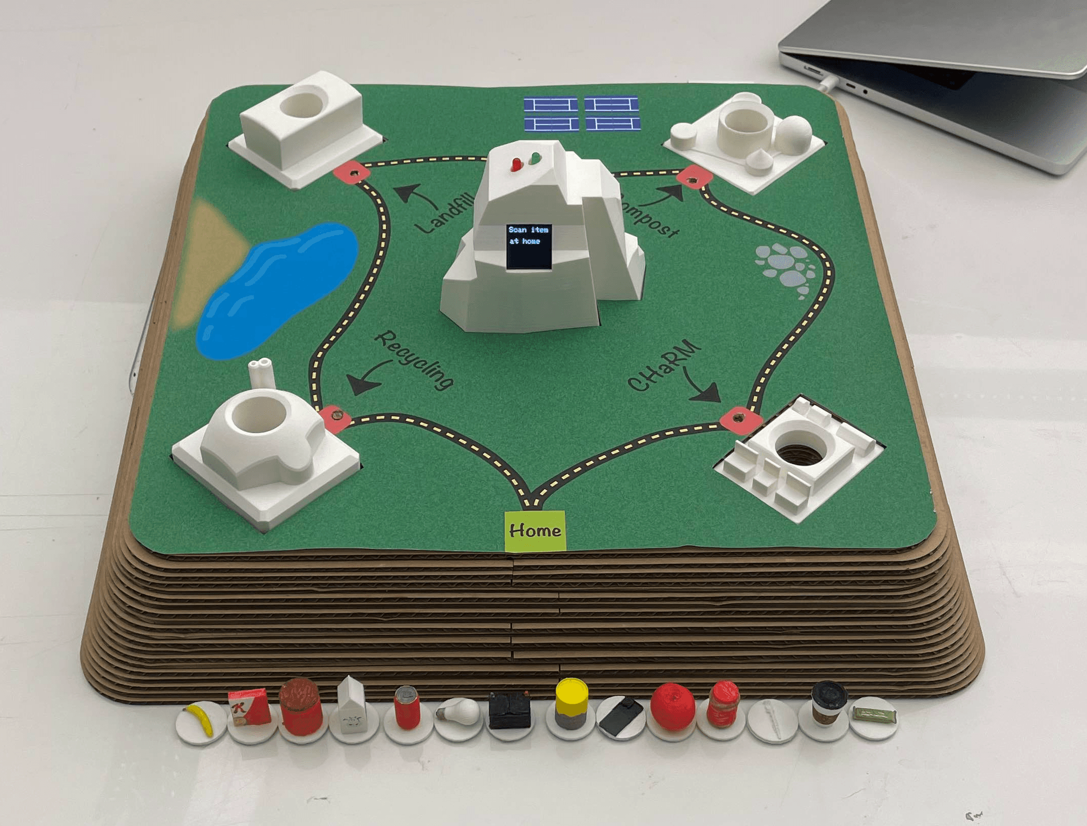 The game board showcases a central mountain, featuring a dynamic screen projecting hints and points. Four corners house disposal stations, while the 'Home' area accommodates the RFID reader. Red squares mark sensor locations, enhancing the interactive design.